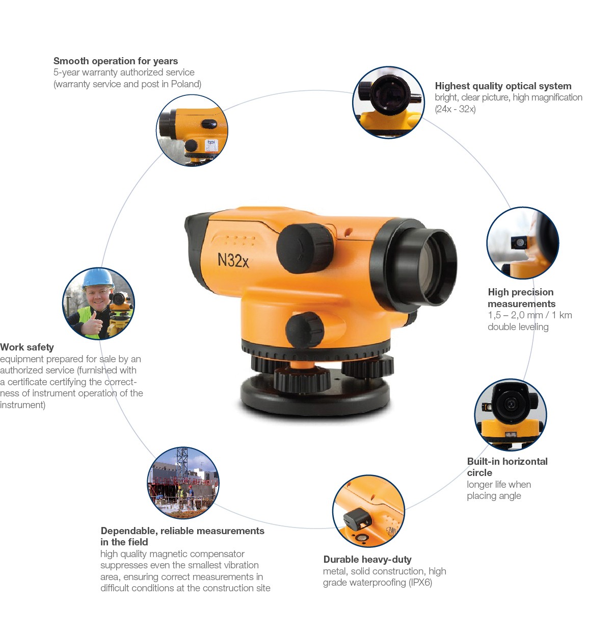 Thanks to the high quality of the optical system ( lunette with a magnification of 32x) level ensures accuracy of 1,5 mm per 1 km in double run. Level can be used both for construction tasks and the exacting geodetic measurements . The image in the lunette is clear and legible.